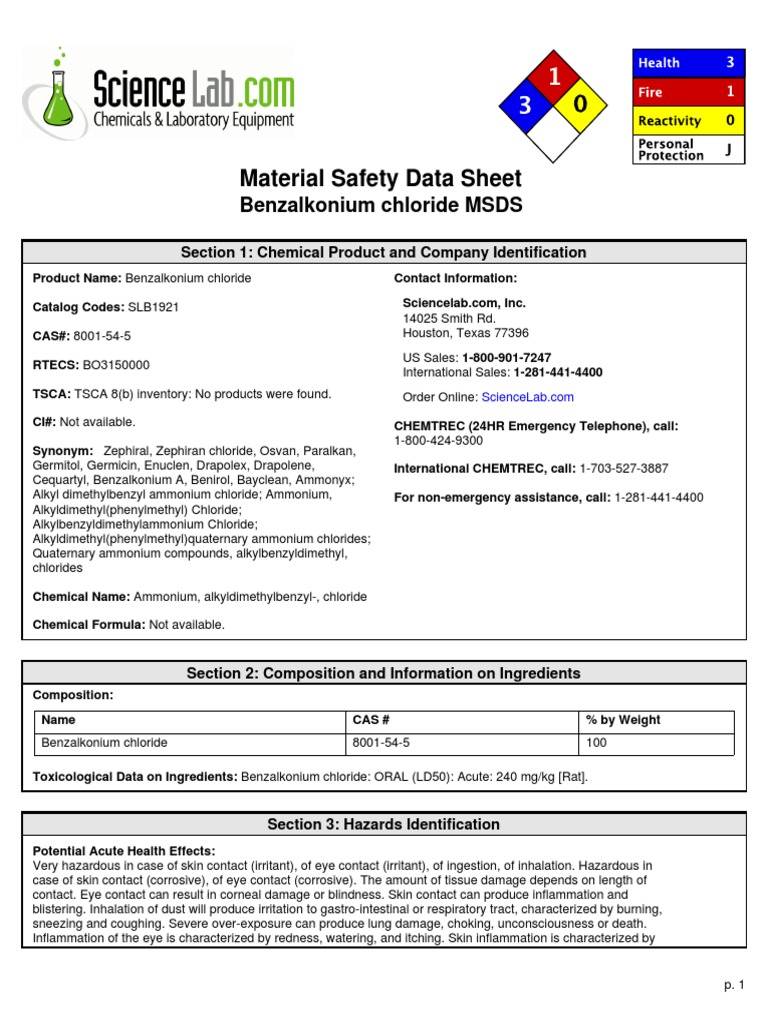 MSDS Benzalkonium Chloride Toxicity Chemistry