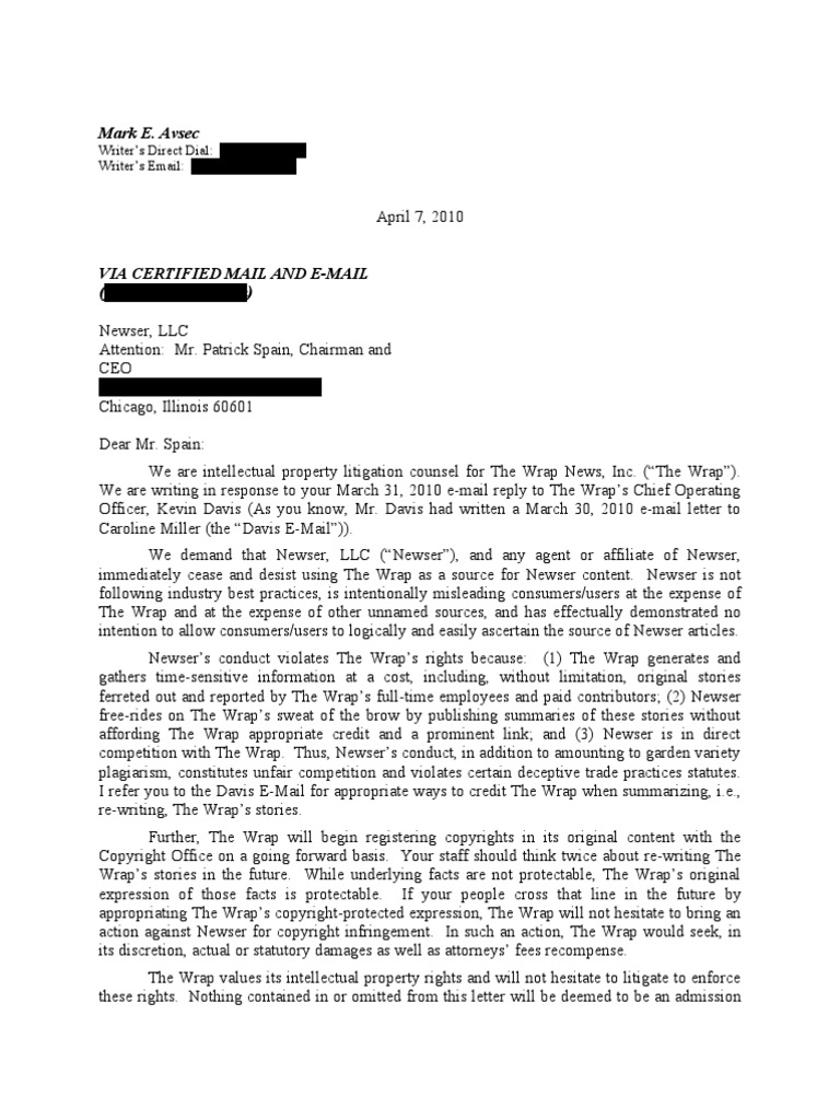 Cease and Desist letter from TheWrap to Newser Copyright Government