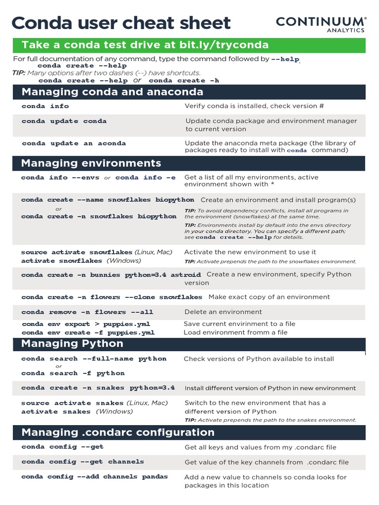 Web conda cheat sheet command line package and environment manager learn to use conda in 30 minutes at bit.ly/tryconda tip: Versions # conda 4.14.x (latest) conda 4.12.x conda. In this cheat sheet, learn all about the basics of working with conda. From managing and installing packages, to working with channels & environments, learn the fundamentals of the conda package.