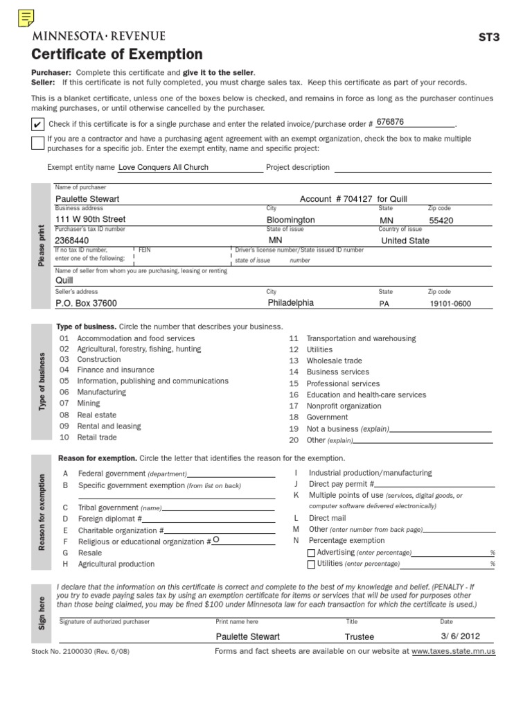 If this certificate is not completed, you must charge sales tax. Web to claim the exemption, give your supplier a completed form st3, certificate of exemption. If your employee purchases taxable items that you later reimburse. To complete form st3 you will need to provide either your minnesota tax id number,.