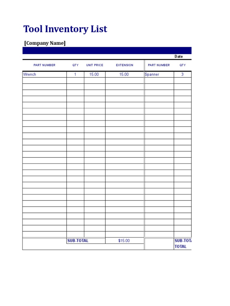 Tool Inventory Sheet Tool Inventory List