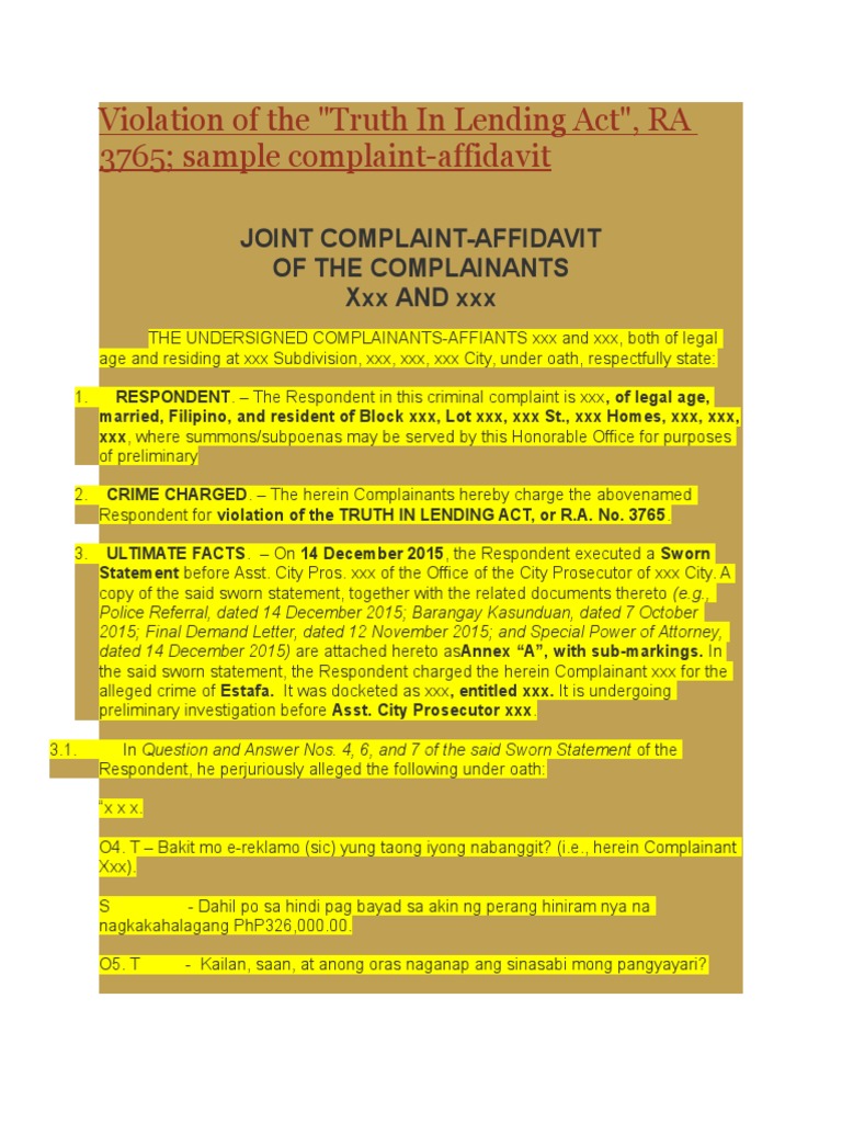 Violation of the Truth Lending Act, Sample Complaint Credit (Finance