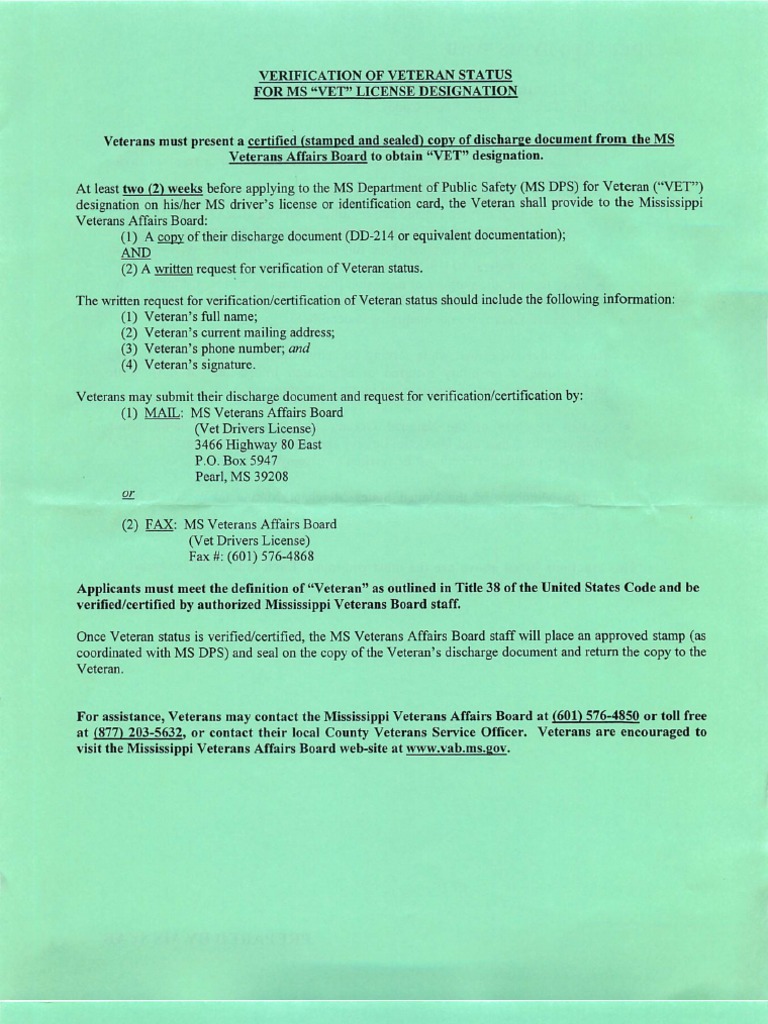 Verification of Veteran Status for MS "VET" DRIVERS LICENSE DESIGNATION